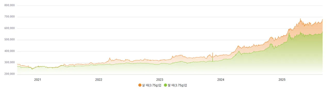 국내 금값 역시 5년치 추이를 확인해보면, 뚜렷한 상승 곡선을 그리고 있습니다.
