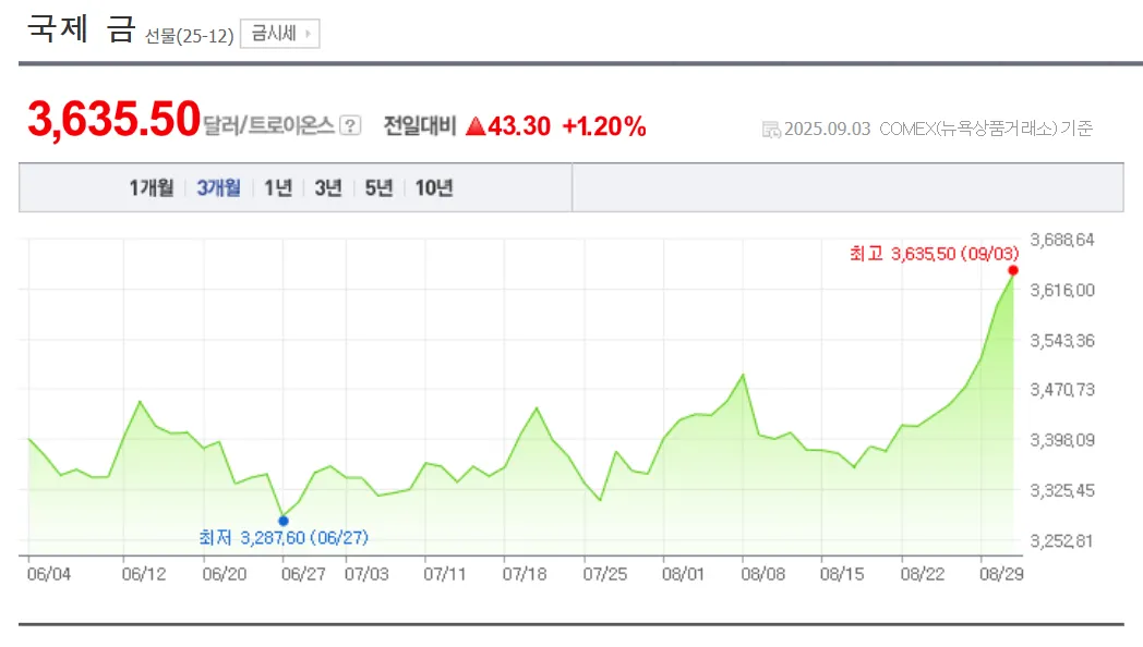 금값이 사상 처음으로 3,600달러 선을 돌파한 것은, 국제 투자자들이 미 국채에서 금으로 투자 비중을 조정하기 시작한 것으로 해석됩니다.