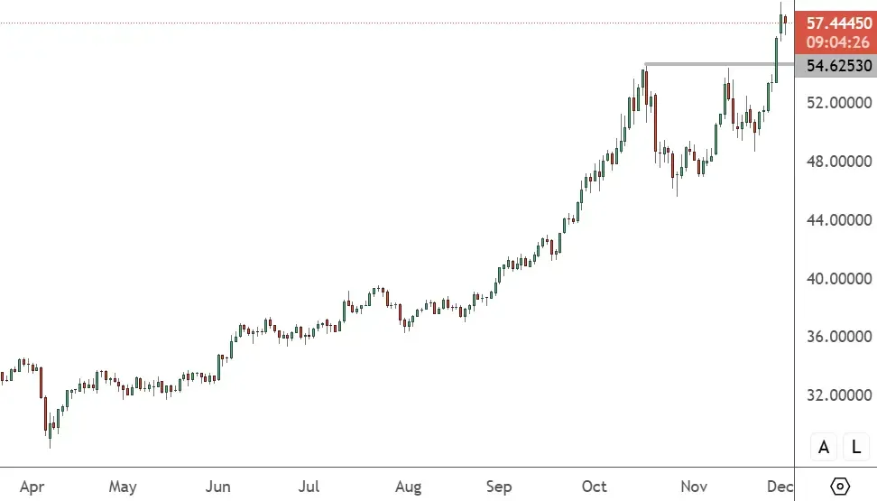은 가격은 12월 5일 약 58.28달러를 기록하며 단기 급등했고, 월간으로는 약 20% 가까운 상승세를 나타냈습니다.