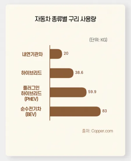 전기차 한 대에는 평균 75kg 이상의 구리가 사용됩니다.