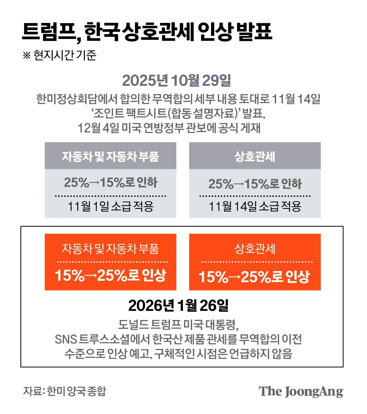 도널드 트럼프 미국 대통령은 한국 국회의 대미투자특별법 처리 지연을 문제 삼으며 한국산 자동차 등 주요 품목에 대한 관세를 기존 15%에서 25%로 다시 인상하겠다고 경고했습니다.