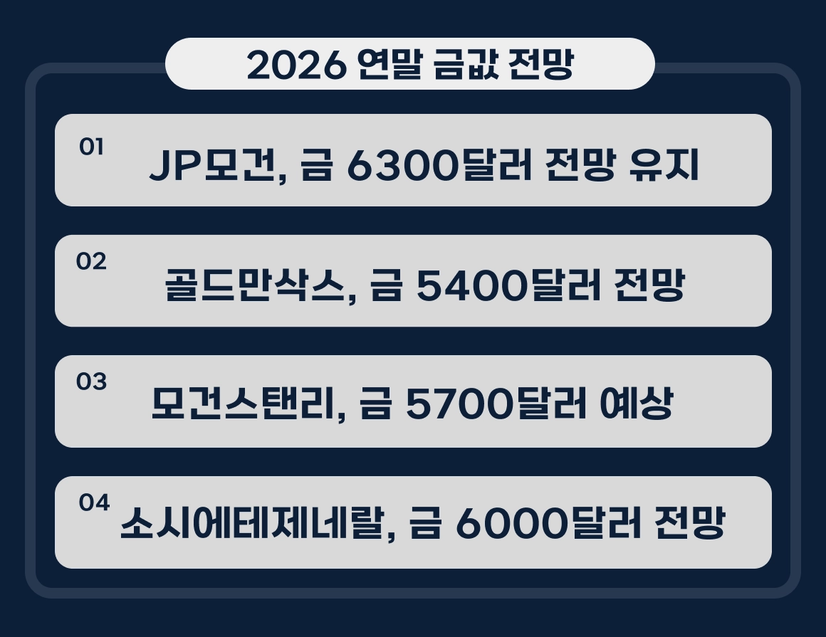 단기 급락에도 불구하고 JP모건, 골드만삭스 등 주요 투자은행들은 금 시장의 장기 상승 전망을 유지하고 있습니다.