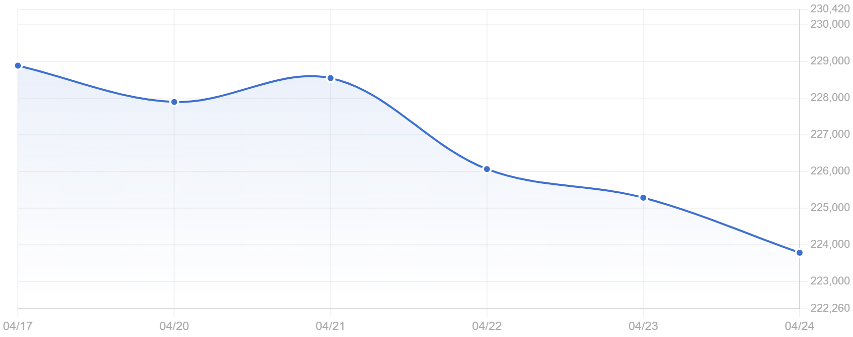 이번 주 금 시장은 글로벌 불확실성 속에서도 뚜렷한 방향성을 찾지 못한 채 약세를 보였습니다. 4월 24일 기준 국제 금시세(COMEX)는 지난주 온스당 4,806.41달러에서 4,726.7달러로 약 1.66% 하락했습니다. 국내 순금(24K) 역시 살 때 기준 98만 2,000원으로 전주 대비 1.41% 내렸고, 팔 때 가격은 3.53% 하락한 82만 원을 기록하며 전반적인 하방 압력을 받았습니다.