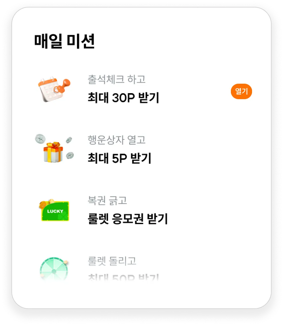 출석 체크, 룰렛 돌리기, 복권 긁기, 행운상자, 포인트 모으기 등 다양한 미션을 완료하고 트레져러 포인트를 쌓아보세요! 포인트 모으기는 하루에 횟수 제한 없이 계속 참여 가능한거 아시죠?