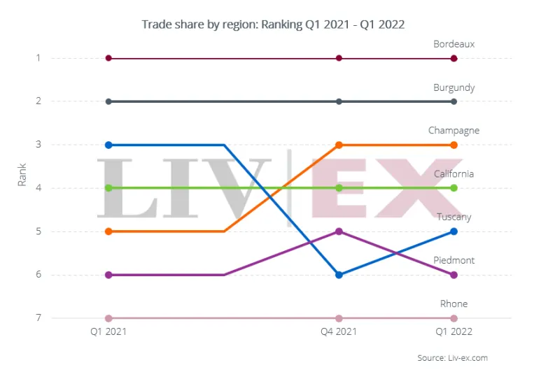 1분기에도 부르고뉴와 샹파뉴산 와인은 세컨더리 마켓에서 강세를 보였습니다. 부르고뉴는 25%, 샹파뉴는 11.5%의 무역 점유율을 기록했습니다. 반면 보르도는 32.8%의 점유율로 전체 무역에서 선두를 이어갔지만, 이는 2021년 1분기 점유율인 36.1%을 밑돌았습니다.