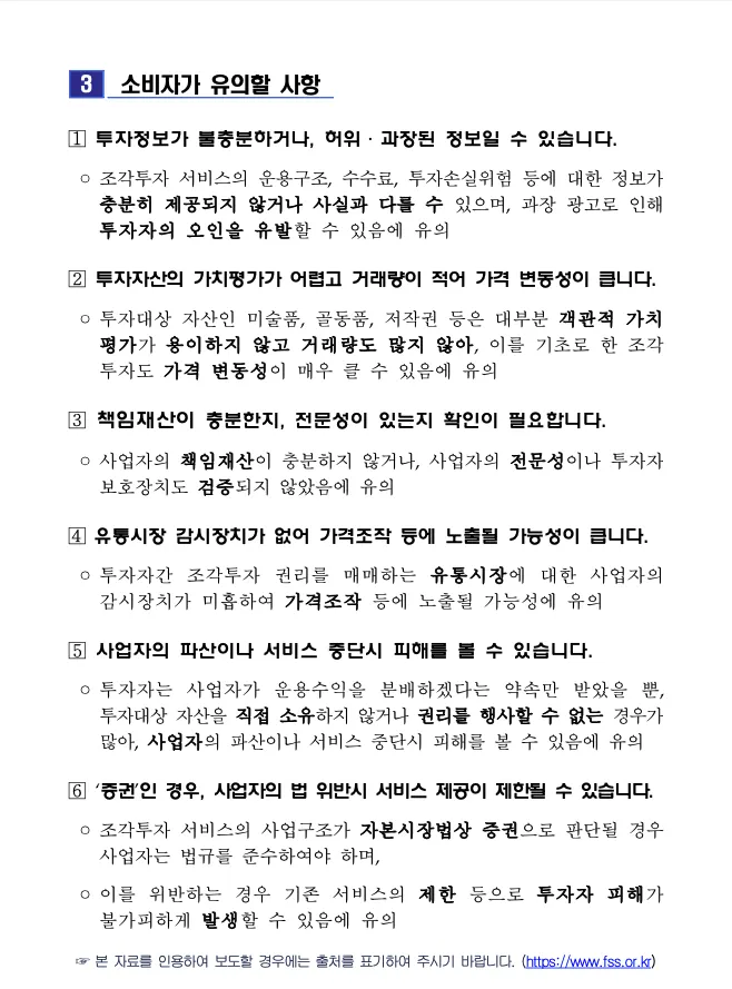 최근 금융감독원이 조각투자 서비스 투자자의 주의 환기를 위해 소비자경보