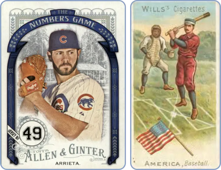 미국 담배회사 ‘앨런 앤드 긴터(Allen and Ginter)’와 영국의 ‘W.D. & H.O. Willis’가 주요 고객인 남성을 타깃으로 스포츠, 전쟁 등의 내용을 담아 마케팅 용도로 사용하면서 진화되었는데요. 사람들이 카드를 모으기 위해 담배를 사는 현상이 일어나자 스포츠 카드의 붐이 시작. *트레이딩 카드의 유래도 이때부터 시작되었다고 합니다. 하지만 제 2차 세계 대전 발발 후 종이 부족으로 시장이 몰락했습니다.