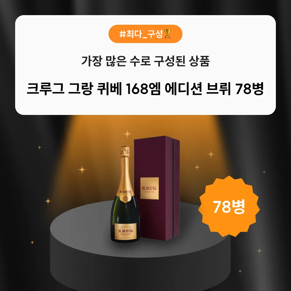구성 상품이 가장 많았던 조각상품은 크루그 그랑 퀴베 168엠 에디션 브뤼 78병입니다.