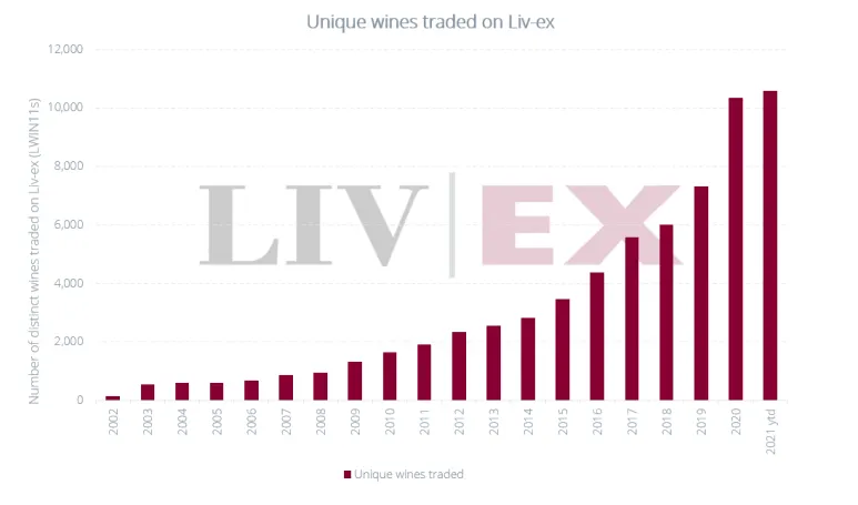 올해 지금까지 10,603개의 다양한 와인과 증류주가 세계 시장에서 거래되었으며, 이는 2020년 전체에 비해 2.4% 증가한 수치입니다. 이 수치는 10년 전보다 거의 7배 증가한 수치입니다.